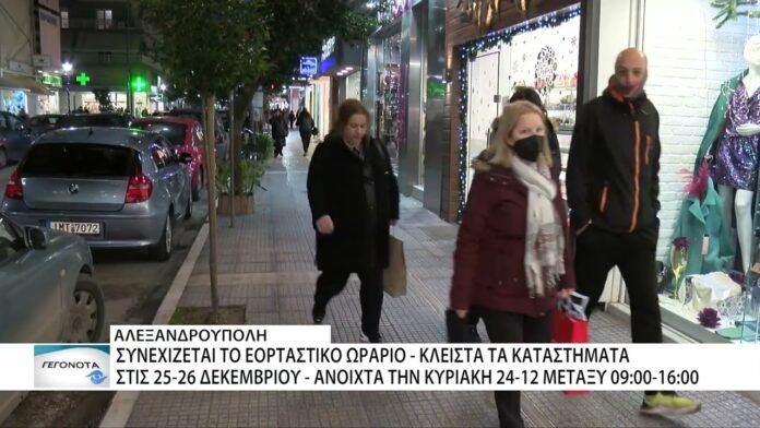 Στην τελική ευθεία για τις γιορτές των Χριστουγέννων και τα εμπορικά καταστήματα της Αλεξανδρούπολης λειτουργούν σε εορταστικούς ρυθμούς, με τροποποιημένο ωράριο. Το Σάββατο η αγορά θα είναι ανοιχτή από τις 9 έως τις 3 και την Κυριακή, παραμονή Χριστουγέννων από τις 11 έως τις 4. Τα χριστούγεννα και τη δεύτερη μέρα Χριστουγέννων στις 26 του μήνα τα καταστήματα θα είναι κλειστά, όπως επίσης και στις 1 και 2 Ιανουαρίου, του νέου έτους.