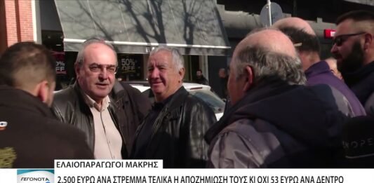 Ακόμη περιμένουν τις αποζημιώσεις τους οι ελαιοπαραγωγοί της Μάκρης, μετά και την τελευταία εξέλιξη με τη δημοσίευση της Κοινής Υπουργικής Απόφασης των υπουργείων Οικονομικών και Αγροτικής Ανάπτυξης που θέλει την αποζημίωσή τους σε άμεσο χρονικό διάστημα. Ωστόσο ο τρόπος αποζημίωσης έχει αλλάξει και πλέον τα χρήματα που θα λάβουν οι δενδροπαραγωγοί είναι ανά στρέμμα και … Continue reading Ανά στρέμμα κι όχι ανά δέντρο θα αποζημιωθούν τελικά οι ελαιοπαραγωγοί της Μάκρης