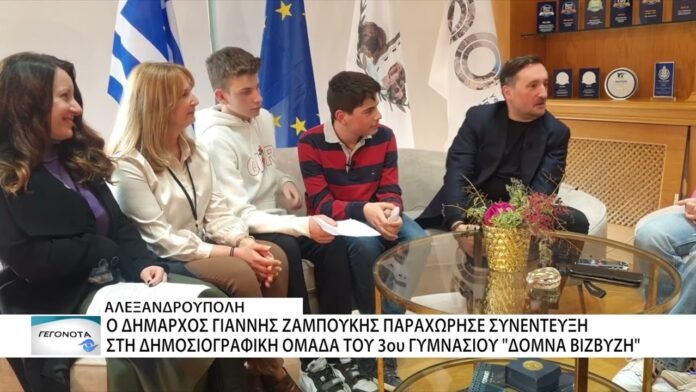Mία διαφορετική συνέντευξη παραχώρησε ο Δήμαρχος Αλεξανδρούπολης, Γιάννης Ζαμπούκης, στους μαθητές της δημοσιογραφικής ομάδας του 3ου Γυμνασίου Αλεξ/πολης “Δόμνα Βιζβύζη”. Ο Δήμαρχος απάντησε σε όλες με αυθορμητισμό και χαρούμενη διάθεση.