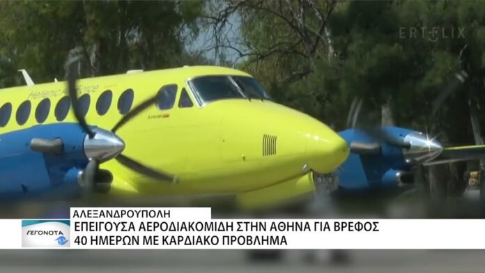 Ένα βρέφος 40 ημερών διεκομίσθη αργά το βράδυ της Τρίτης από το αεροδρόμιο της Αλεξανδρούπολης στην Αθήνα. Το νεογνό αντιμετώπισε πρόβλημα με την καρδιά του και η διακομιδή του κρίθηκε ως επείγουσα.