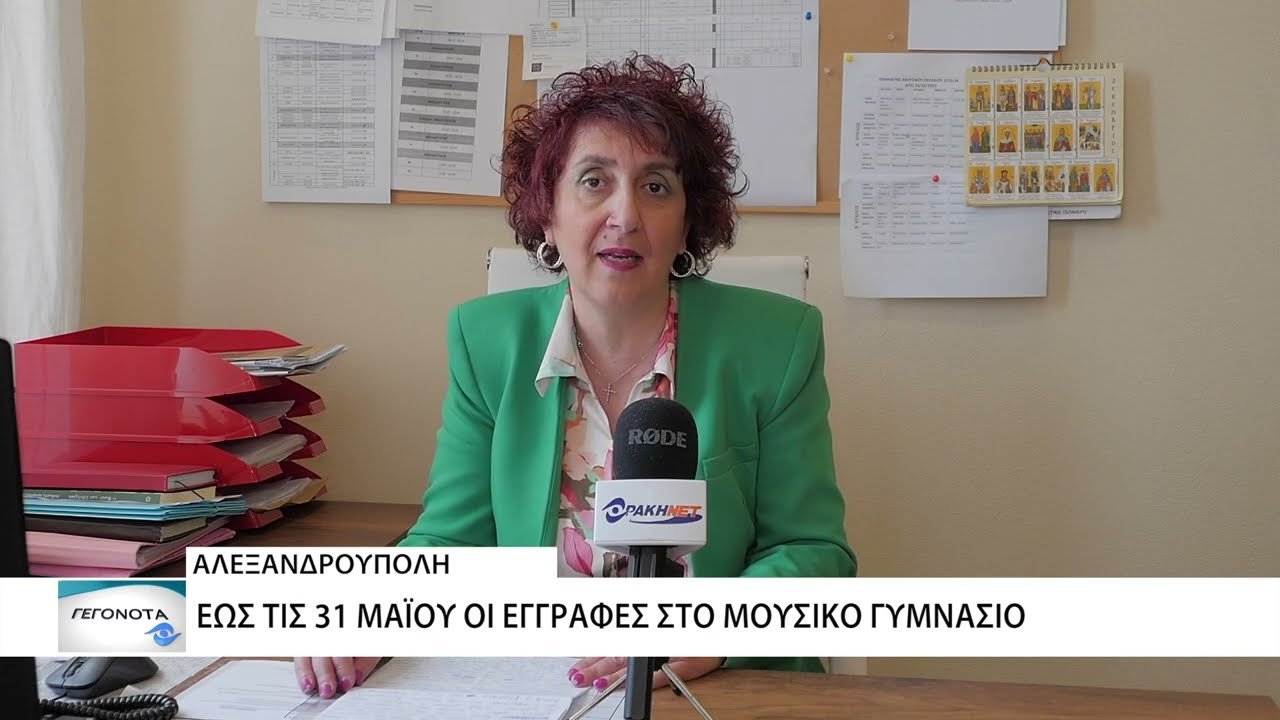 Μέχρι και στις 31 Μαΐου θα διαρκέσουν οι εγγραφές στο Μουσικό Γυμνάσιο Αλεξανδρούπολης. Η διευθύντρια του σχολείου Ευφροσύνη Χαραλαμπίδου, μιλά στο ΘΡΑΚΗ ΝΕΤ και εξηγεί τους λόγους για τους οποίους προτρέπει τους μαθητές που τελειώνουν τώρα το δημοτικό να εγγραφούν στο μουσικό γυμνάσιο.