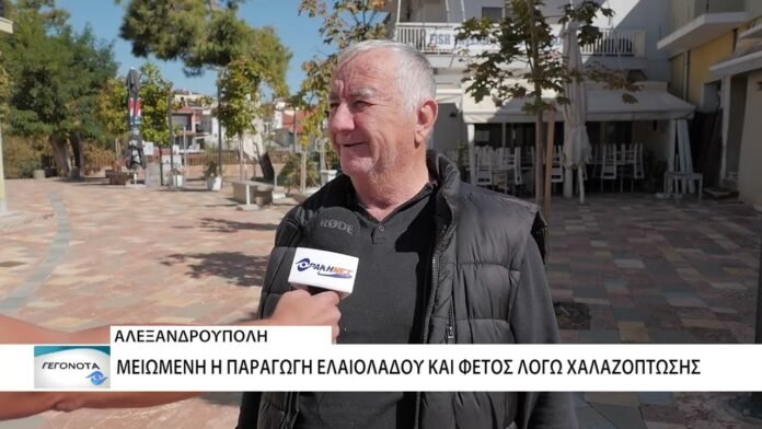 Μειωμένη θα είναι και φέτος η παραγωγή ελαιολάδου στην ευρύτερη περιοχή της Αλεξανδρούπολης, καθώς πρόσφατα μια χαλαζόπτωση στους ελαιώνες χτύπησε τους καρπούς των δέντρων 10 ημέρες πριν την συγκομιδή τους. Κλιμάκια του υπουργείου αγροτικής ανάπτυξης κατέγραψαν τις ζημιές.