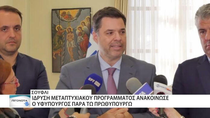 Την ίδρυση Μεταπτυχιακού Προγράμματος Σπουδών του Δημοκρίτειο Πανεπιστήμιο Θράκης με έδρα το Σουφλί και θέμα την «Πρόληψη και Διαχείριση Κρίσεων & Φυσικών Καταστροφών» ανακοίνωσε από την Αλεξανδρούπολη, ο Υφυπουργός παρά τω Πρωθυπουργώ, Θανάσης Κοντογεώργης.