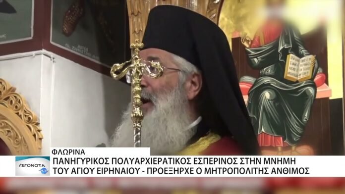 Με εκκλησιαστική λαμπρότητα τελέστηκε το απόγευμα της Τετάρτης 20 Αυγούστου στον Ιερό Μητροπολιτικό Ναό Αγίου Παντελεήμονος Φλώρινας ο Μέγας Πολυαρχιερατικός Εσπερινός, όπου η τοπική Εκκλησία τίμησε τη μνήμη του Αγίου ενδόξου Ιερομάρτυρος Ειρηναίου, Επισκόπου Λουγδούνου. Της ακολουθίας προεξήρχε ο Σεβασμιώτατος Μητροπολίτης Αλεξανδρουπόλεως κ. Άνθιμος.