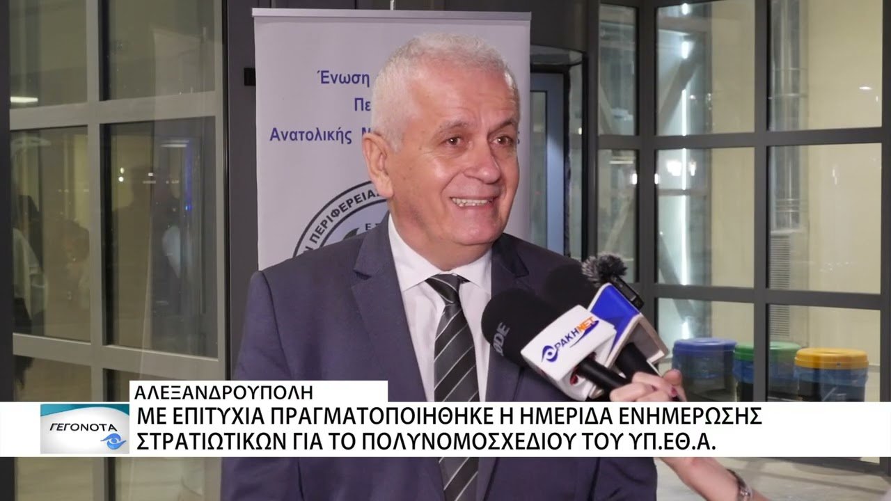 Το απόγευμα της Παρασκευής 24 Οκτωβρίου στην Αλεξανδρούπολη, πραγματοποιήθηκε ημερίδα ενημέρωσης στρατιωτικών με θέμα το πολυνομοσχέδιο του Υπουργείου Εθνικής Άμυνας. Η εκδήλωση διοργανώθηκε από την Ένωση Στρατιωτικών Περιφέρειας Ανατολικής Μακεδονίας και Θράκης σε συνεργασία με την Πανελλήνια Ομοσπονδία Ενώσεων Στρατιωτικών.