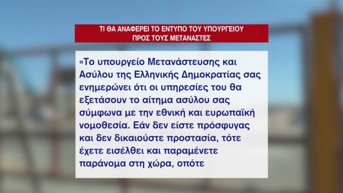 Έντυπο με προειδοποιήσεις για πιθανή ποινή φυλάκισης θα λαμβάνουν οι μετανάστες πριν υποβάλουν αίτηση ασύλου, σύμφωνα με το υπουργείο Μετανάστευσης. Το έγγραφο θα ενημερώνει ότι η παράνομη είσοδος ή παραμονή στη χώρα συνιστά ποινικό αδίκημα, με προβλεπόμενη φυλάκιση από 2 έως 5 έτη.