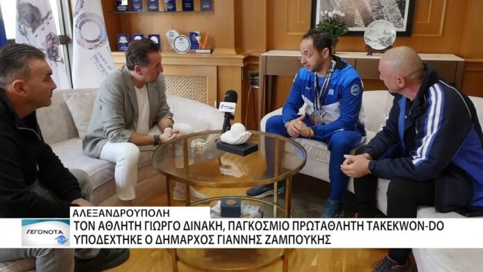 Τον αθλητή Γιώργο Δινάκη, Παγκόσμιο Πρωταθλητή στο Taekwon-Do για το 2025, καθώς και τον προπονητή του Ιωάννη Ζάχο, υποδέχτηκε το πρωί της Δευτέρας στο γραφείο του ο δήμαρχος Αλεξανδρούπολης Γιάννης Ζαμπούκης, εκφράζοντας τα θερμά του συγχαρητήρια για τις σπουδαίες τους διακρίσεις. Ο αθλητής κατέκτησε ένα αργυρό και ένα χάλκινο μετάλλιο στην κατηγορία Υψηλόβαθμων Εκπαιδευτών Βετεράνων Αθλητών, στο Παγκόσμιο Πρωτάθλημα που πραγματοποιήθηκε στο Τζεσόλο της Ιταλίας.