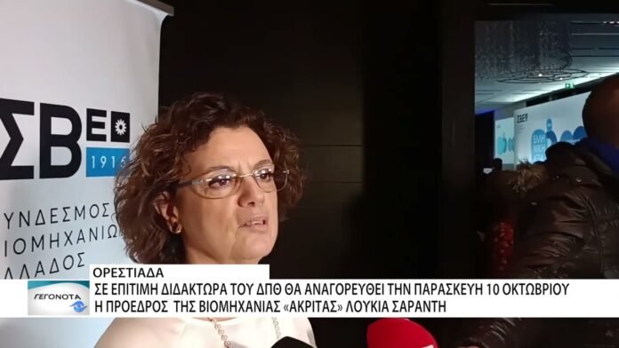 Η Πρόεδρος της ΑΚΡΙΤΑΣ Α.Ε. και του Συνδέσμου Βιομηχανιών Ελλάδος, Λουκία Σαράντη, αναγορεύεται σε Επίτιμη Διδάκτορα του Τμήματος Δασολογίας του ΔΠΘ για τη συμβολή της στη βιώσιμη ανάπτυξη και την ενίσχυση της ελληνικής βιομηχανίας. Η τελετή θα πραγματοποιηθεί στις 10 Οκτωβρίου στην Ορεστιάδα.