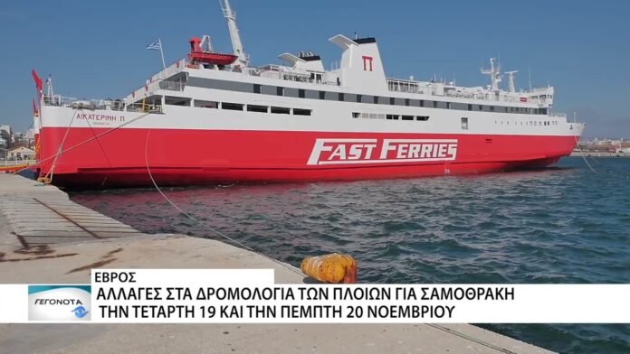 Τροποποιήσεις στα δρομολόγια της γραμμής Αλεξανδρούπολη – Σαμοθράκη ανακοίνωσαν οι ακτοπλοϊκές εταιρείες, εξαιτίας των δυσμενών καιρικών συνθηκών που επικρατούν στο Θρακικό Πέλαγος. Οι αλλαγές αφορούν τις 19 και 20 Νοεμβρίου 2025 και επηρεάζουν τα πλοία ΑΙΚΑΤΕΡΙΝΗ Π. και ΑΔΑΜΑΝΤΙΟΣ ΚΟΡΑΗΣ.