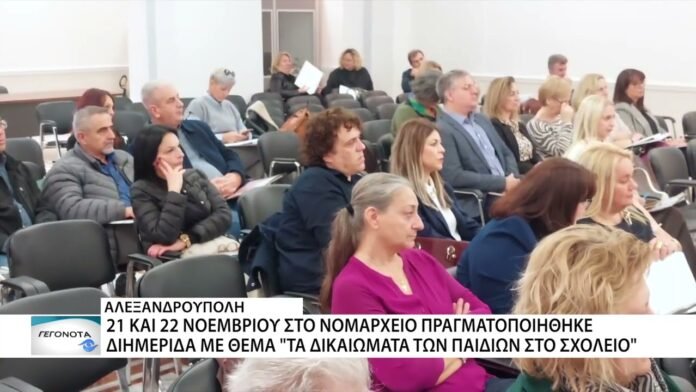 Η Διεύθυνση Δευτεροβάθμιας Εκπαίδευσης Έβρου και η Περιφέρεια Ανατολικής Μακεδονίας Θράκης πραγματοποίησαν επιμορφωτική Διημερίδα υπό την Αιγίδα του Υπουργείο Παιδείας Θρησκευμάτων και Αθλητισμού με θέμα :”Η προστασία των δικαιωμάτων των παιδιών στο σχολικό περιβάλλον”. Η διημερίδα πραγματοποιήθηκε στο Νομαρχείο Αλεξανδρούπολης την Παρασκευή 21 Νοεμβρίου και το Σάββατο 22 Νοεμβρίου.