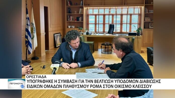 Υπογράφηκε στο γραφείο του Δημάρχου Ορεστιάδας Αδαμάντιου Παπαδόπουλου η σύμβαση για την υλοποίηση του έργου «Βελτίωση Υποδομών Διαβίωσης ειδικών ομάδων πληθυσμού Ρομά στον οικισμό Κλεισσού». Με αυτή την υπογραφή, ένα έργο που είχε προετοιμαστεί το προηγούμενο διάστημα ξεκινά πλέον να υλοποιείται, σηματοδοτώντας ένα ουσιαστικό βήμα για τη βελτίωση της περιοχής και των συνθηκών διαβίωσης της κοινότητας Ρομά.