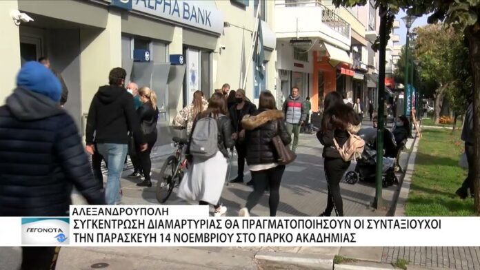 Μετά τις περιφερειακές συσκέψεις Σωματείων Συνταξιούχων που πραγματοποιήθηκαν το προηγούμενο διάστημα, θα γίνουν συγκεντρώσεις της Συντονιστικής Επιτροπής Αγώνα των Συνεργαζόμενων Συνταξιουχικών Οργανώσεων εντός του Νοέμβρη. Στην Ανατολική Μακεδονία – Θράκη, η συγκέντρωση των συνταξιούχων θα πραγματοποιηθεί την Παρασκευή 14 Νοεμβρίου στις 10.30 το πρωί στο Πάρκο Ακαδημίας στην Αλεξανδρούπολη.