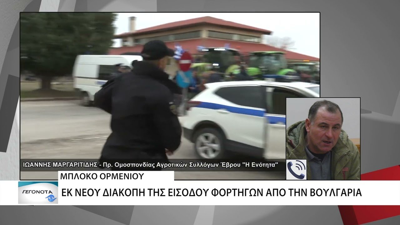 Σε εκ νέου διακοπή της κυκλοφορίας των φορτηγών στο μπλόκο του Ορμενίου προχώρησαν οι αγρότες, μετά από συνεδρίαση που πραγματοποιήθηκε το Σάββατο 27 Δεκεμβρίου. Η είσοδος φορτηγών από τη Βουλγαρία αποκλείστηκε επ’ αόριστον, ενώ η έξοδος επιτρέπεται σε συγκεκριμένες ώρες, την ώρα που οι κινητοποιήσεις συνεχίζονται και με νέες δράσεις.