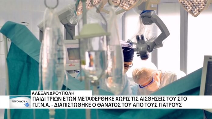 Ένα παιδί 3 μόλις ετών μεταφέρθηκε χωρίς τις αισθήσεις του από τη μητέρα του στο Πανεπιστημιακό Γενικό Νοσοκομείο Αλεξανδρούπολης, όπου διαπιστώθηκε ο θάνατός του. Οι αρχές ερευνούν όλες τις πιθανές αιτίες και αναμένονται οι επίσημες απαντήσεις από τη νεκροψία – νεκροτομή.