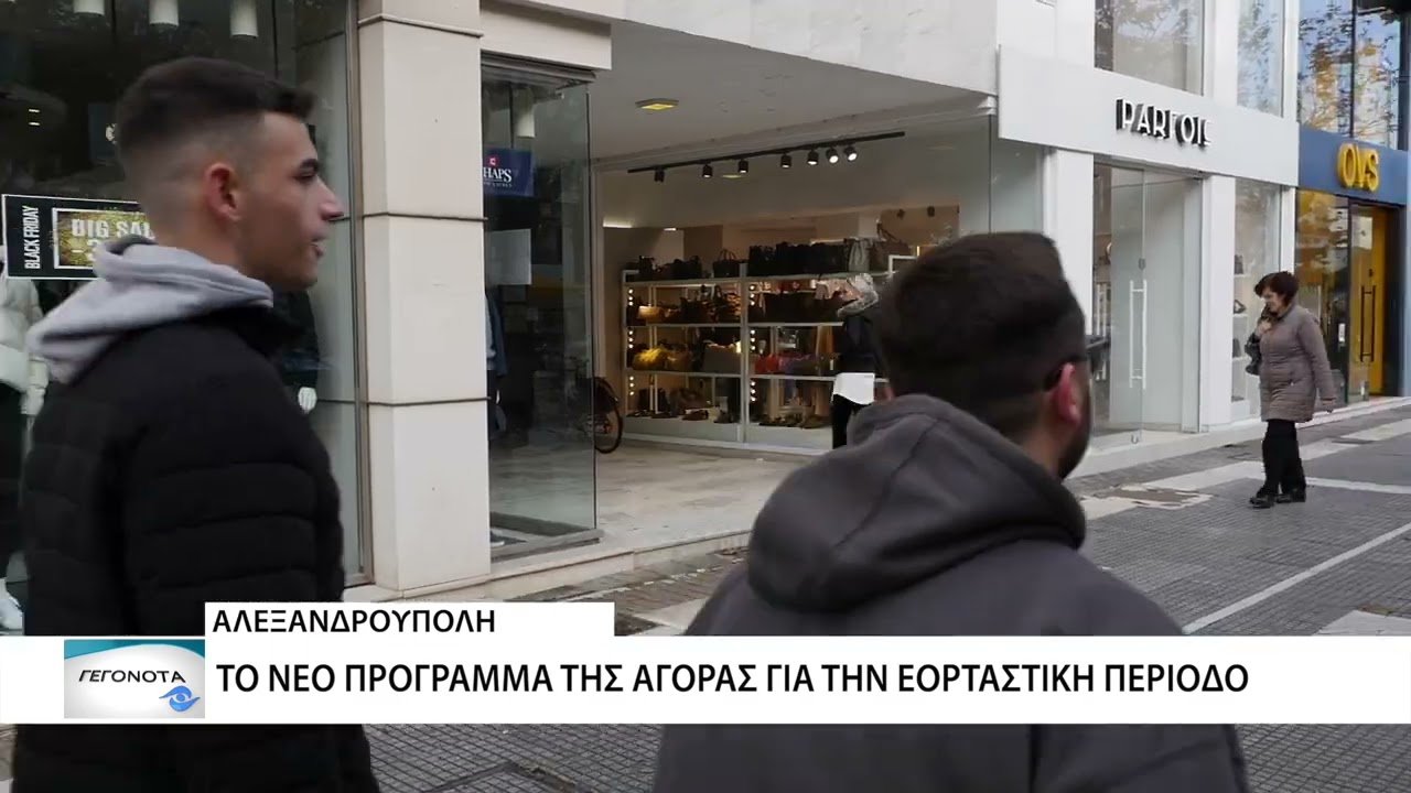 Σε εορταστικό κλίμα κινούνται ήδη τα εμπορικά καταστήματα ενόψει Χριστουγέννων και Πρωτοχρονιάς, με την αγορά να ετοιμάζεται για να υποδεχτεί ντόπιους αλλά και τουρίστες. Ο Εμπορικός Σύλλογος Αλεξανδρούπολης ανακοίνωσε το εορταστικό ωράριο των καταστημάτων για τα Χριστούγεννα και την Πρωτοχρονιά καλώντας τους κατοίκους να εμπιστευτούν τα μικρά τοπικά καταστήματα για τις αγορές τους.