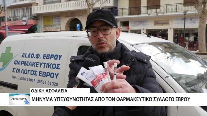 Δράση ενημέρωσης και πρόληψης για την οδική ασφάλεια πραγματοποίησε την Παρασκευή 20 Ιανουαρίου ο Φαρμακευτικός Σύλλογος Έβρου, μπροστά από το Δημαρχείο στην Αλεξανδρούπολη. Τα μέλη του Συλλόγου διένειμαν δωρεάν self-test ανίχνευσης αλκοόλ, τα οποία δείχνουν αποτέλεσμα μέσα σε δύο λεπτά, στέλνοντας μήνυμα υπευθυνότητας και πρόληψης προς όλους τους οδηγούς.
