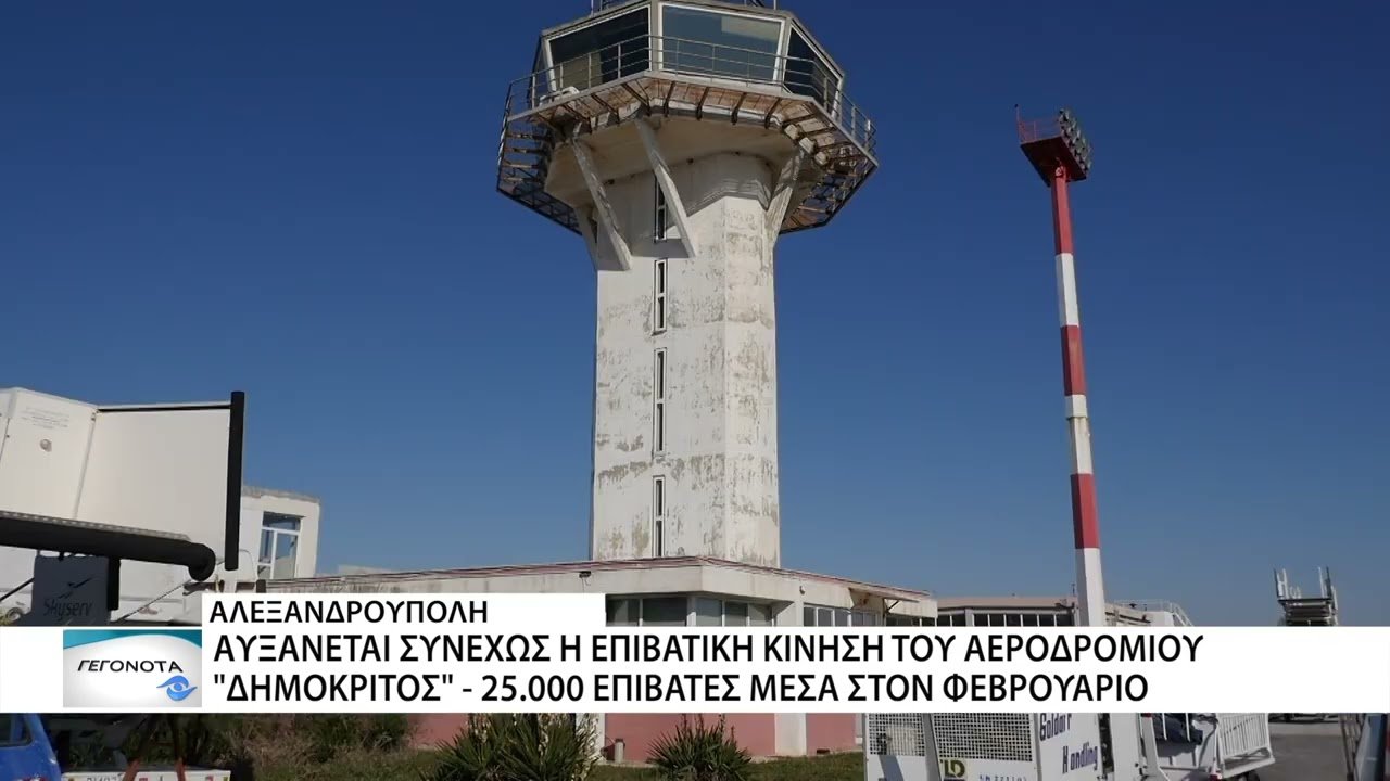 Σημαντική αύξηση κατέγραψε η επιβατική κίνηση στο αεροδρόμιο “ΔΗΜΟΚΡΙΤΟΣ” τον Φεβρουάριο του 2026, συνεχίζοντας τη θετική πορεία που έχει καταγραφεί από τις αρχές του έτους. Συνολικά 25.000 επιβάτες ταξίδεψαν με πτήσεις από τον κρατικό αερολιμένα Αλεξανδρούπολης.