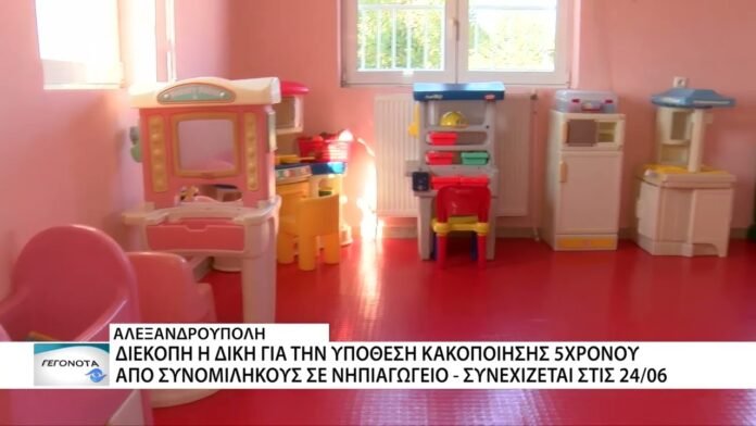 Διακόπηκε για τις 24 Ιουνίου η δίκη για την υπόθεση καταγγελλόμενης κακοποίησης πεντάχρονου σε νηπιαγωγείο στην Αλεξανδρούπολη. Η διαδικασία, που διεξάγεται κεκλεισμένων των θυρών, δεν ολοκληρώθηκε λόγω ωραρίου, ενώ αναμένεται συμπληρωματική εξέταση του παιδιού για διευκρινίσεις στην υπόθεση.Το περιστατικό καταγγέλθηκε τον Σεπτέμβριο του 2024, μετά από αποκάλυψη του παιδιού στους γονείς του και τα ευρήματα ιατροδικαστικής εξέτασης.