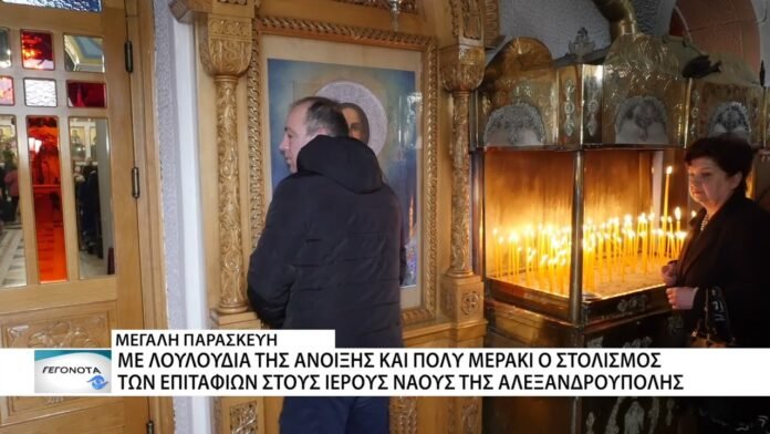 Όλη τους την τέχνη και το μεράκι έβαλαν οι γυναίκες των ενοριών της Αλεξανδρούπολης, που το βράδι της Μεγάλης Πέμπτης ξενύχτησαν για να στολίσουν τους Επιταφίους. Σε όλους τους ναούς της πόλης, οι γυναίκες έδωσαν τον καλύτερο τους εαυτό, ώστε ο επιτάφιος που υποδέχεται το σώμα του Κυρίου να είναι όμορφος και έτοιμος για την περιφορά της Μεγάλης Παρασκευής.